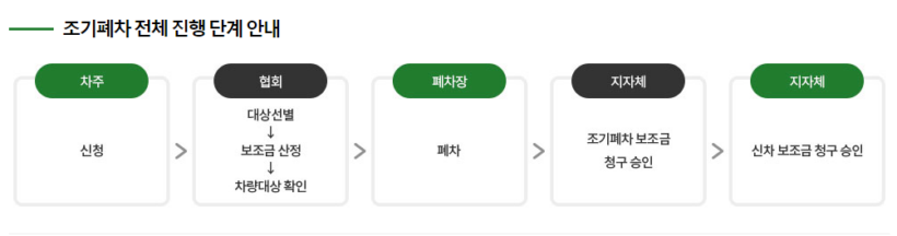| 조기 폐차 보조금 신청 및 지급 | 폐차 인수 확인서를 제출하여 조기 폐차 보상금 신청 → 지급 완료 | 지급 완료까지 순서를 정확히 지켜 진행해야 함 |