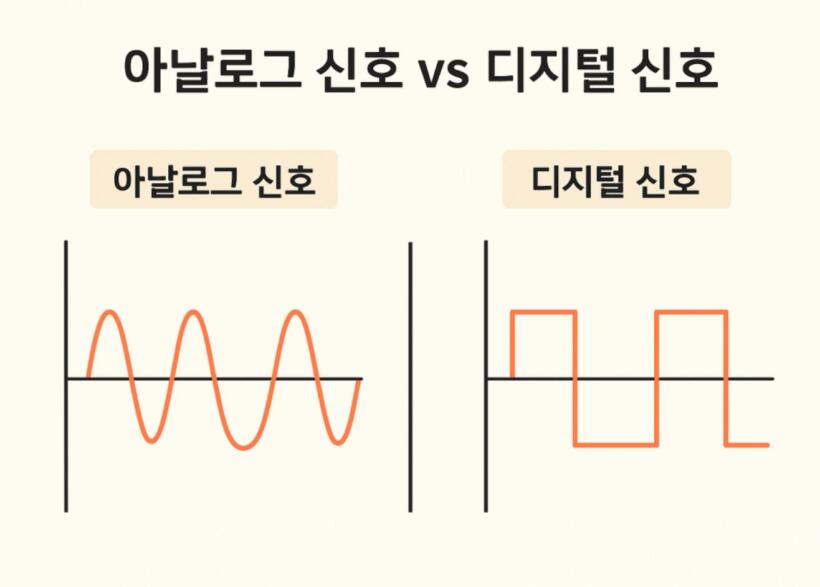 아날로그는 연속적인 신호를 그대로 전달하기 때문에 자연스럽고 부드러운 표현이 가능하지만, 외부 환경이나 노이즈의 영향을 쉽게 받는 단점이 있습니다.